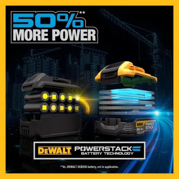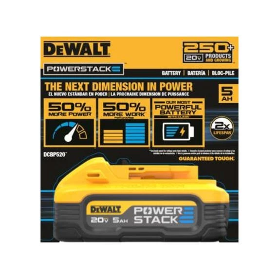 The most powerful battery in its class, the 20V MAX DEWALT POWERSTACK™ 5Ah Battery utilizes revolutionary pouch cell technology to deliver 50% more power, 50% more work per charge, and 2X the lifespan. Compatible with all DEWALT 20V MAX tools and chargers, the DEWALT POWERSTACK™ 5.0 Ah Battery features an impactresistant, rubber overmolded base and includes 3-LED Fuel Gauge state of charge indicator.