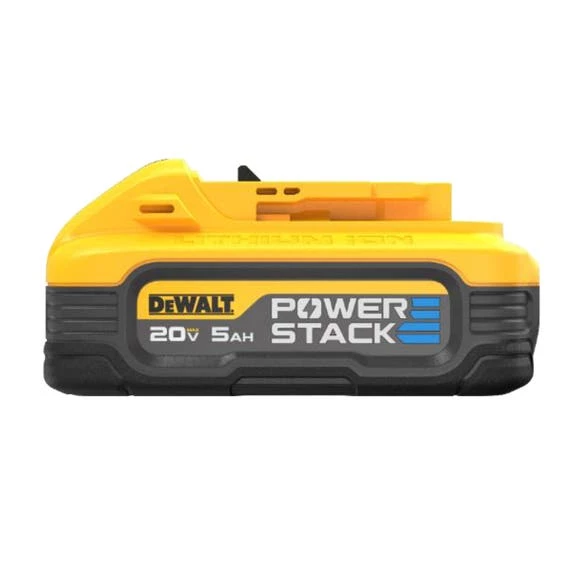 The most powerful battery in its class, the 20V MAX DEWALT POWERSTACK™ 5Ah Battery utilizes revolutionary pouch cell technology to deliver 50% more power, 50% more work per charge, and 2X the lifespan. Compatible with all DEWALT 20V MAX tools and chargers, the DEWALT POWERSTACK™ 5.0 Ah Battery features an impactresistant, rubber overmolded base and includes 3-LED Fuel Gauge state of charge indicator.