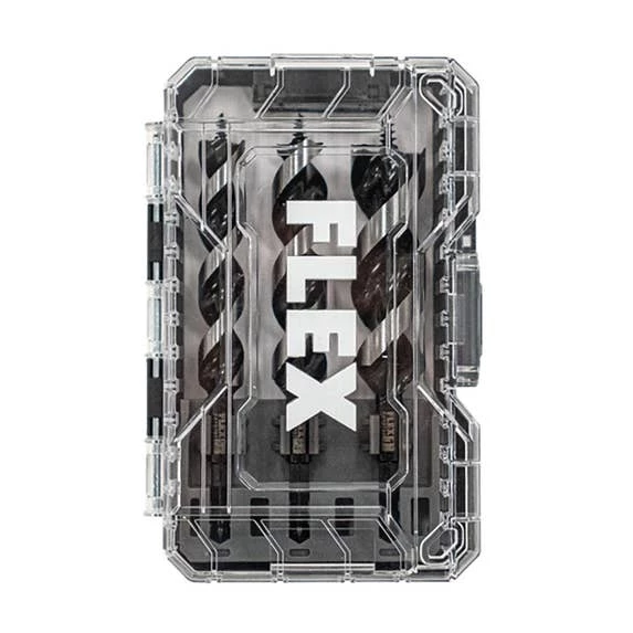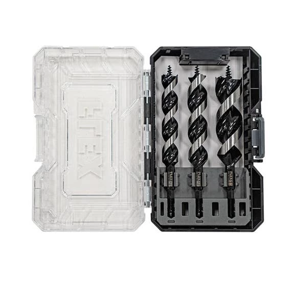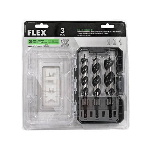 When the job requires you to power through hole after hole with speed and efficiency, the FLEX 3-Piece 1/4” Hex Auger Set dominates. The FLEX Head Speed Cutter delivers fast and efficient burr-free drilling, and Dual Spur Tip Design scores and cuts holes while preventing splitting. The Self-Feeding Tip maximizes engagement for effortless drilling, especially when working overhead. Clogged flutes and jams are an afterthought thanks to the auger’s Anti-Stick Coated Flute. The ¼-inch Hex Shank is compatible with FLEX Drills and Impact Drivers for demanding applications. All this comes packed in a FLEX STACK PACK™ storage case for customizable organization and easy accessibility in any case in the STACK PACK™ lineup.