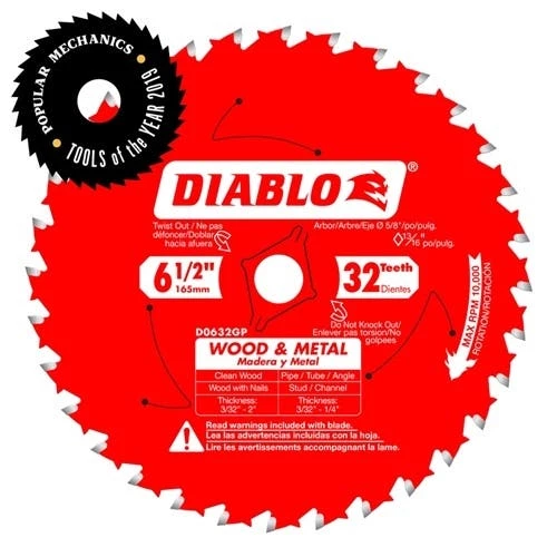 Diablo’s new 6-1/2” Wood & Metal saw blade is the industry’s first multi-purpose saw blade for cutting clean wood and wood with nails; up to 2” material thickness; and metal ranging from 3/32”-1/4” wall thickness and 1/4”-1” diameter. The versatility of these new blades provides the ability to use the same blade to cut wood and metal so now users can focus on completing the job more efficiently rather than wasting time with changing tools and saw blades.