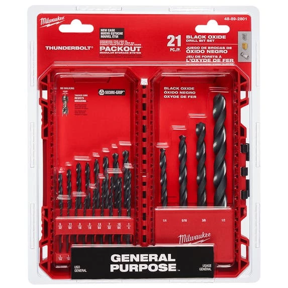 The MILWAUKEE® THUNDERBOLT® 21PC Black Oxide Drill Bit Set offers heavy-duty performance on the jobsite. Black Oxide coating reduces heat build-up and provides corrosion resistance. The thicker core provides ultimate strength and protects against side-load breakage while a specially designed parabolic flute form clears chips and debris fast to keep the bit cool. The 135° split point tip delivers a precision start and prevents walking for fast, accurate holes. MILWAUKEE® THUNDERBOLT® Black Oxide Coated bits are ideal for various drilling applications in wood, plastics, and metals. The set is organized in a customizable accessory case designed for use in PACKOUT™.