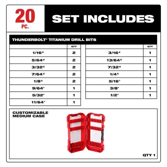 The MILWAUKEE® THUNDERBOLT® 20PC Titanium Drill Bit Set offers heavy-duty performance on the jobsite. Titanium coating reduces heat build-up and keeps the bit sharper providing up to 3X longer life. The thicker core provides ultimate strength and protects against side-load breakage while a specially designed parabolic flute form clears chips and debris fast to keep the bit cool. The 135° split point tip delivers a precision start and prevents walking for fast, accurate holes. MILWAUKEE® THUNDERBOLT® Titanium Coated bits are ideal for various drilling applications in wood, plastics, and metals. The set is organized in a customizable accessory case designed for use in PACKOUT™.