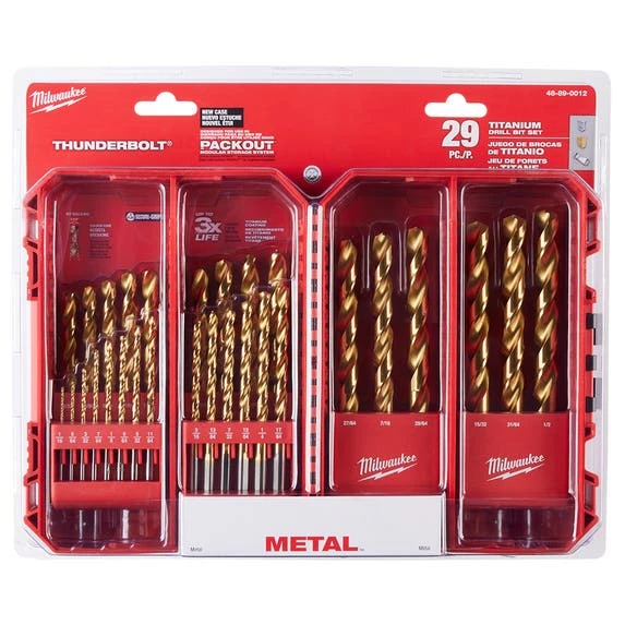 The MILWAUKEE® THUNDERBOLT® 29PC Titanium Drill Bit Set offers heavy-duty performance on the jobsite. Titanium coating reduces heat build-up and keeps the bit sharper providing up to 3X longer life. The thicker core provides ultimate strength and protects against side-load breakage while a specially designed parabolic flute form clears chips and debris fast to keep the bit cool. The 135° split point tip delivers a precision start and prevents walking for fast, accurate holes. MILWAUKEE® THUNDERBOLT® Titanium Coated bits are ideal for various drilling applications in wood, plastics, and metals. The set is organized in a customizable accessory case designed for use in PACKOUT™.